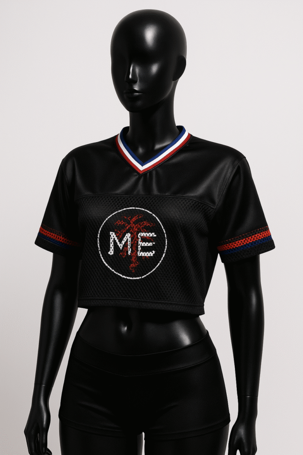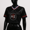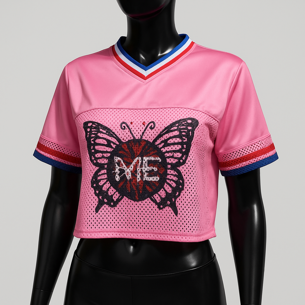 This is a stylish cropped sports top in a vibrant shiny pink color, made from satin fabric on the upper part and breathable mesh below. The front features a bold black butterfly graphic with the word “ME” written in the center over a red and blue circular design. The short sleeves are accented with red, white, and blue striped bands, which are also reflected in the neckline for a sporty and energetic look. The top is displayed on a sleek, glossy black mannequin that highlights the vividness and contrast of the shirt. This piece blends athletic flair with a personal statement, perfect for someone who wants to stand out with confidence and style.