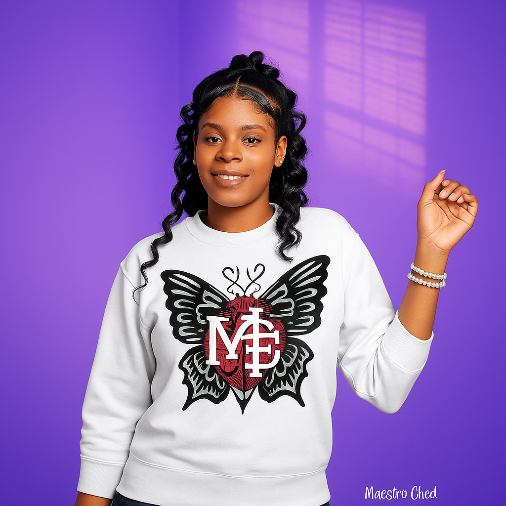 This sweater is made from high-quality polyester, offering exceptional comfort and durability for everyday wear. It features a bold and artistic design on the front: a striking butterfly with a red heart at the center, highlighted by stylized “M” and “F” letters interwoven to create a powerful symbol of identity and strength. The bright white background makes the graphic pop and allows for easy styling with other outfits. This sweater is the perfect choice for anyone looking to express originality, comfort, and uniqueness in their daily style.